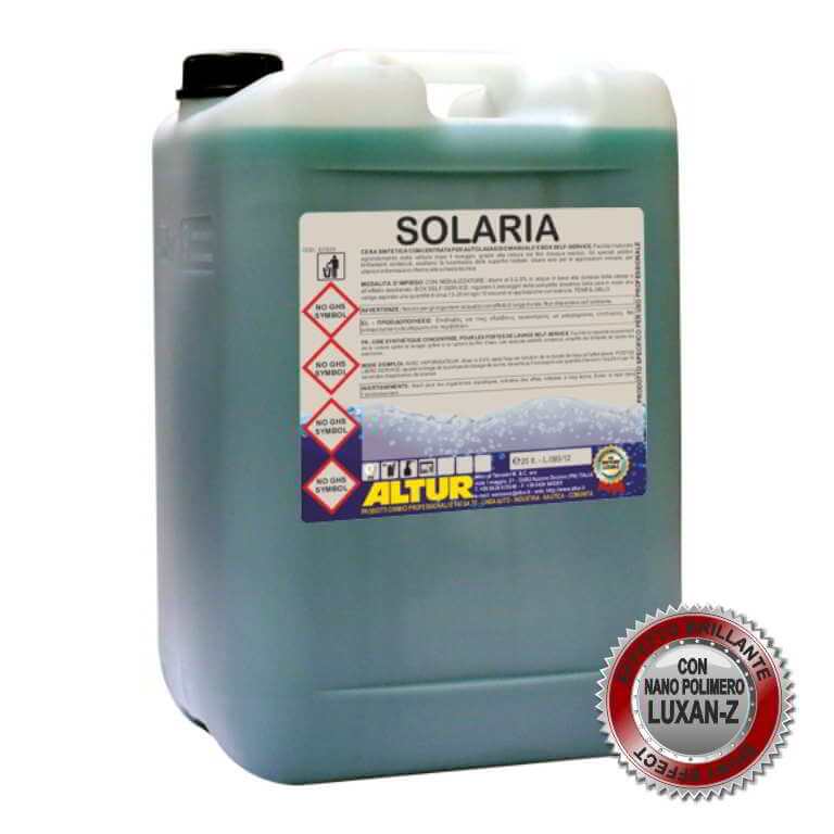 SOLARIA – je vosak pogodan za završno ispiranje, pogodan za korištenje kod ručnog pranja i kod samoposlužnih autopraonica. Ovaj vosak pruža visok sjaj vozilima. Voda klizi sa vozila efektivno da čak nije potrebno sušenje vozila puhanjem (u automatskim praonama). Sredstvo se razrjeđuje 2-2,5 % vodom ovisno o tvrdoći vode. Kod automatske autopraonice dozirati pumpu da koristi oko 25-30 ml po vozilu. Kod samoposlužnih autopraona podesite pumpu za doziranje da ispušta vosak 10 sekundi (upotrijebiti 10-15 ml proizvoda po vozilu).