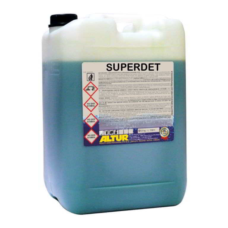 SUPERDET – Super koncentrirani jaki alkalni deterdžent, odmašćivač, sa antistatičkim učinakom, pruža sjajan završni sjaj. Idealno za intenzivno pranje, pruža sličan ili bolji učinak čišćenja od dvokomponentnih proizvoda, uklanjajući nečistoću bez četkanja. Sadrži poseban aditiv za pružanje sjaja vozilima i za poboljšanje mogućnosti ispiranja. Preporučuje se za pranje kamiona, cerada, donje dijelove šasije, spremnike, automobile, motore, mehaničke dijelove. Odlčno djeluje čak i uz tvrdu vodu. Način upotrebe:Vanjsko pretpranje vozila: razrijediti 1,5-2% vodom, nanijeti na površinu, isprati vodom pod visokim tlakom. Uobičajeno čišćenje i industrija: 2-3% razrijedite vodom. Odmašćivanje kotača i motora: razrijedite 10-20% vodom.