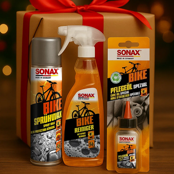 Božićni paket za kompletno čišćenje i održavanje bicikala sadrži bike čistač 750ml,bike specijalno ulje za njegu 50ml i bike vosak u spreju 300ml