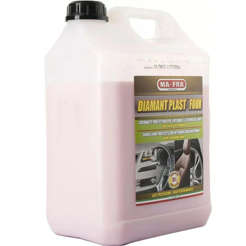 Tretman njege za kožu i plastične dijelove unutrašnjosti automobila. Stvara dugotrajnu zaštitnu barijeru i onemogućuje ponovno prianjanje prašine. Zahvaljujući efektu polimerne barijere na plastici u kombinaciji s biljnim voskom intenzivno hrani i štiti tretirano područje. Ne mrlja i ne izbjeljuje plastične dijelove. Ugodnog je mirisa. Primjena: Razrijedite u omjeru 1:1 s vodom. Poprskajte proizvod na željene dijelove i obrišite mekom, suhom krpom.
